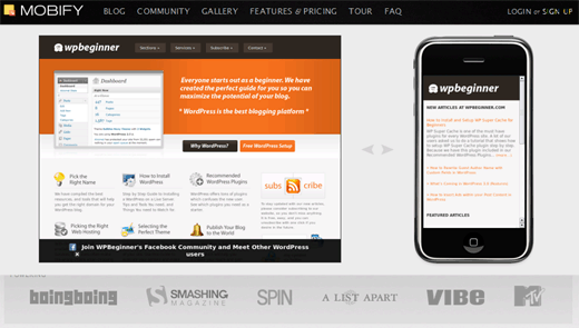 Mobify is a free service that makes WordPress, Drupal and other websites mobile-friendly. Supports iPhone, Android, BlackBerry and 5000+ other devices. Many top brands including, MTV, Sitepoint, Boingboing, Smashingmagazine, Discover Magazine and others are using Mobify. WPBeginner’s mobile version is also powered by mobify. Mobify allows you to customize your site design and it is a great pack for designers. WordPress mobify plugin.
