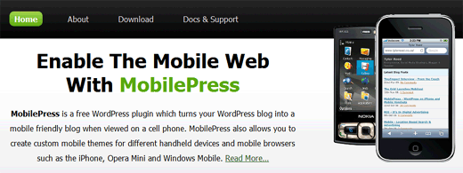 MobilePress is a free WordPress plugin which turns your WordPress blog into a mobile friendly blog when viewed on a cell phone. MobilePress also allows you to create custom mobile themes for different handheld devices and mobile browsers such as the iPhone, Opera Mini and Windows Mobile.
