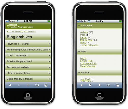 WordPress Mobile Edition is a plugin by Crowd Favorite. This plugin shows an interface designed for a mobile device when visitors come to your site on a mobile device. Mobile browsers are automatically detected, the list of mobile browsers can be customized on the settings page.
