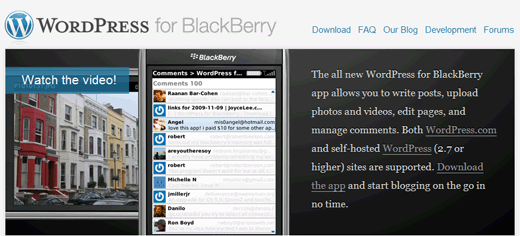 Official WordPress for BlackBerry app allows you to write posts, upload photos and videos, edit pages, and manage comments. Both WordPress.com and self-hosted WordPress (2.7 or higher) sites are supported.