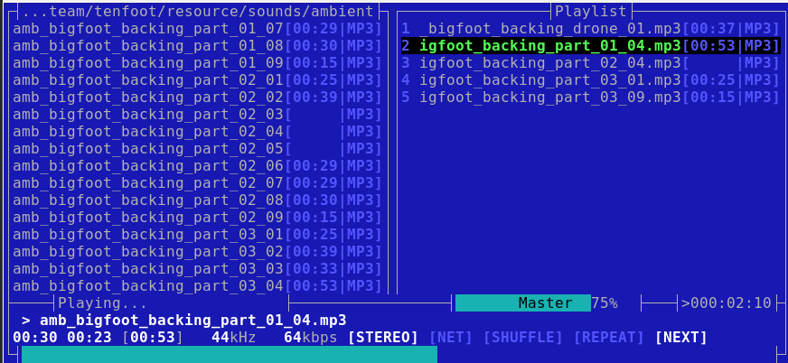 You’ll see something like Figure 1, a nice Midnight Commander-style two-pane file manager where you can navigate all over your filesystem and find audio files to play. Figure 1 has a playlist in the right pane; add files from the left pane to your playlist by highlighting them and pressing the a key. Press V to save your playlist in the current directory.