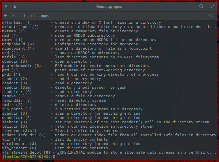 What if you needed a command to work with a directory, but had no idea what command was required? Type apropos “directory” to see every command that contains the word “directory” in its man page (Figure 3).