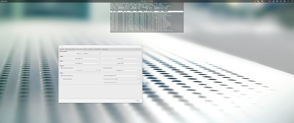 Once installed, open Tilda from your desktop menu, which will also open the configuration window. Configure the app to suit your taste and then close the configuration window. You can then open and close Tilda by hitting the F1 hotkey. One caveat to using Tilda is that, after the first run, you won’t find any indication as to how to reach the configuration wizard. No worries. If you run the command tilda -C it will open the configuration window, while still retaining the options you’ve previously set.