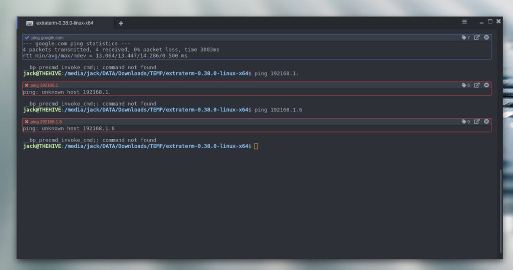 Extraterm should probably win a few awards for coolest feature set of any terminal window project available today. The most unique feature of Extraterm is the ability to wrap commands in color-coded frames (blue for successful commands and red for failed commands – Figure 4).