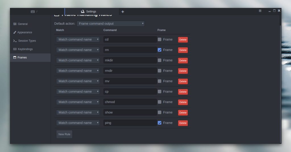 If you run a command, and don’t see a frame appear, you probably have to create a new frame for the command (as Extraterm only ships with a few default frames). To do that, click on the Extraterm menu button (three horizontal lines in the top right corner of the window), select Settings, and then click the Frames tab. In this window, scroll down and click the New Rule button. You can then add a command you want to work with the frames option (Figure 6).
