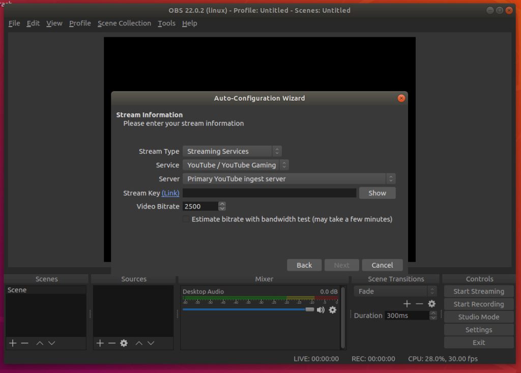 Upon installation (the software is only officially supported for Ubuntu Linux 14.04 and newer), you will be asked to walk through an auto-configuration wizard, where you setup your streaming service (Figure 5). This is, of course, optional; however, if you’re using OBS Studio, chances are this is exactly why, so you won’t want to skip out on configuring your default stream.
