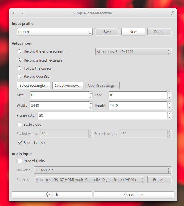 Figure 1: Simple Screen Recorder input profile window.