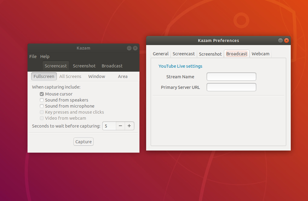 Figure 3: Setting up YouTube Live broadcasting in Kazam.