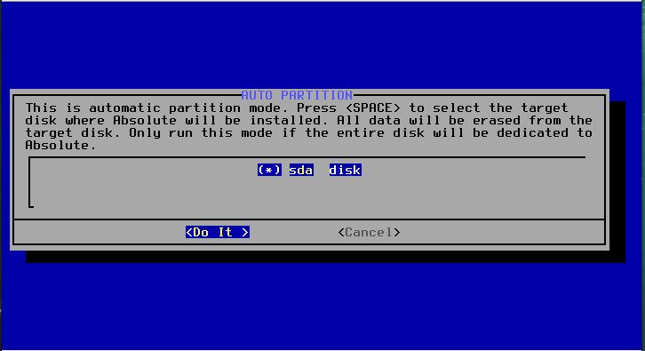 Select AUTOSETUP and the installer will detect your drive. In the next window (Figure 2), make sure to press the spacebar on your keyboard to select the target disk.