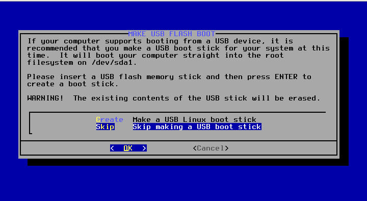 From that point on, the installer is equally as easy (once you get the hang of the ncurses interface). It even offers you the opportunity to create a bootable USB installation of Absolute Linux. If you don’t need this, use your cursor keys to select Skip (Figure 3) and then tab back to OK.