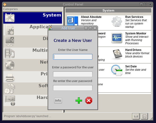 One of the very first things you’ll want to do is create a standard user. For those that don’t like the command line, Absolute Linux has a handy Control Center that includes the ability to create new users. Click Start > Control Center. In the resulting window (Figure 7), click on Add User.