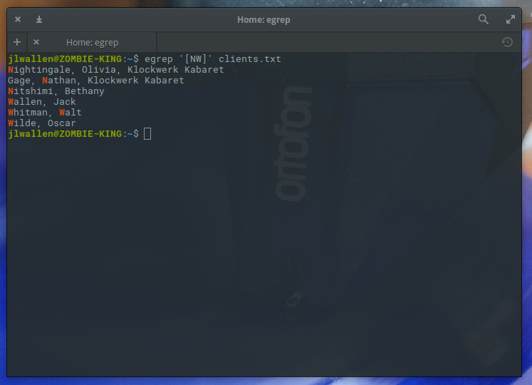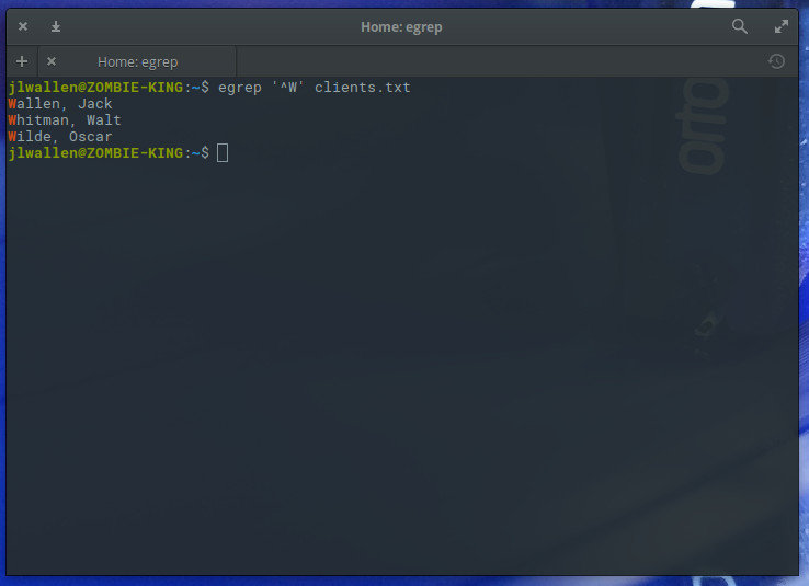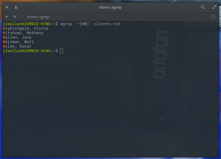 Naturally, this will only work if the first name is the last string of characters on each line. If you wanted to list out all clients whose last name started with either “N” or “W”, you could make use of the metacharacters ^ and [ ] like so: