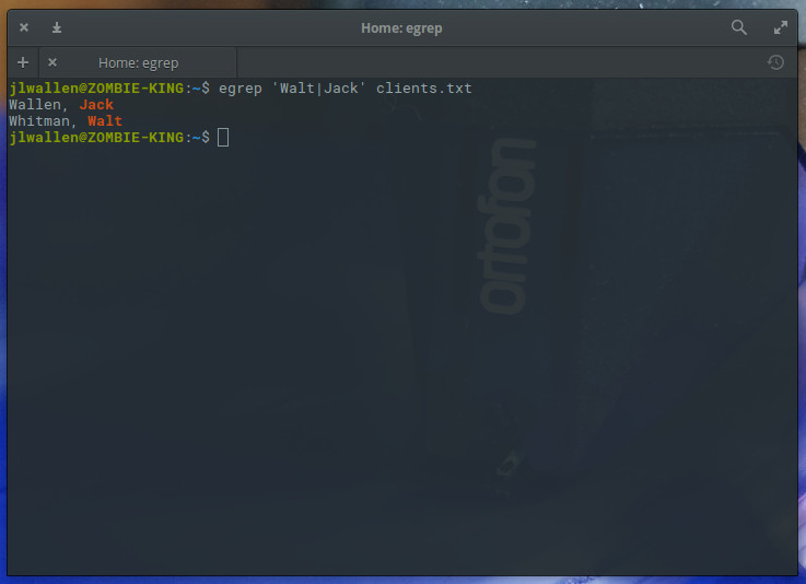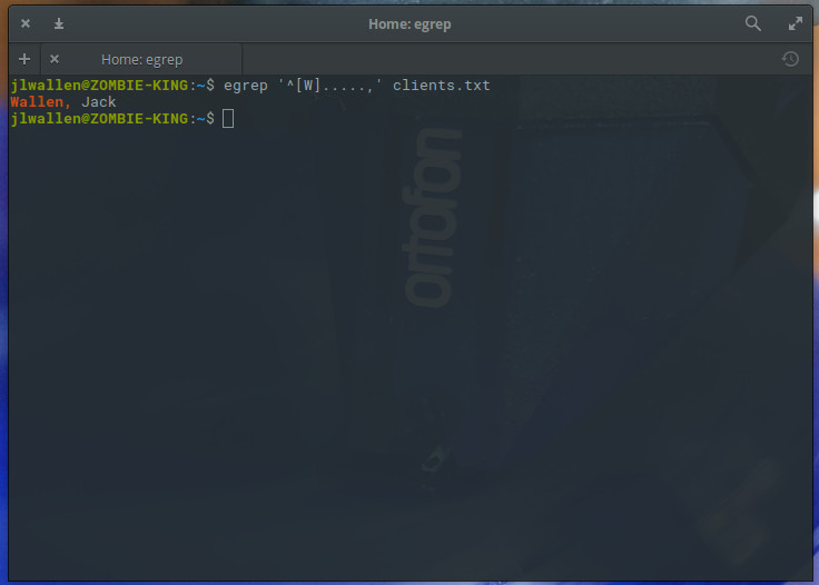 You could use a similar command to search for any characters within a name (such as egrep ‘[en]’ clients.txt), which would list out all strings that contained either letter “e” or “n”.