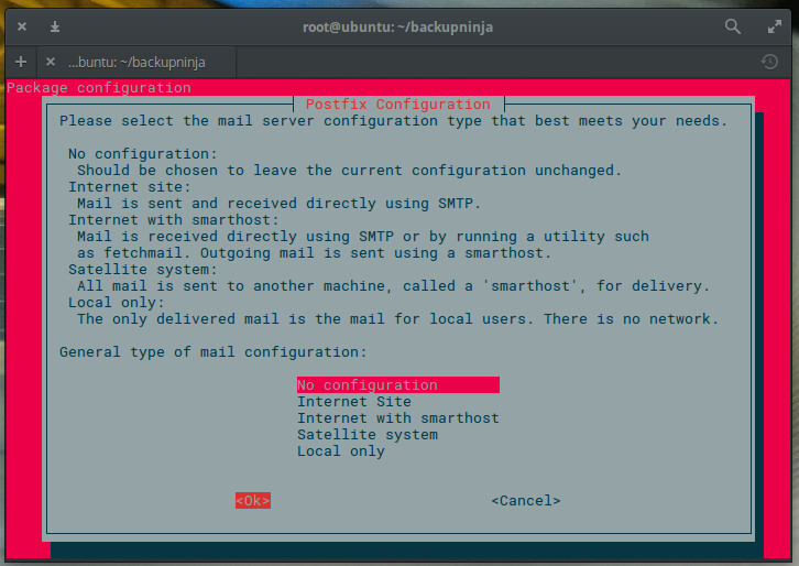 Allow those dependencies; otherwise, the installation will fail. During the installation you will be required to select the mail server configuration type. This is for the delivery of Backupninja reports. If you don’t want this server to function as an SMTP server, select either No configuration or Local only, when prompted (Figure 1).