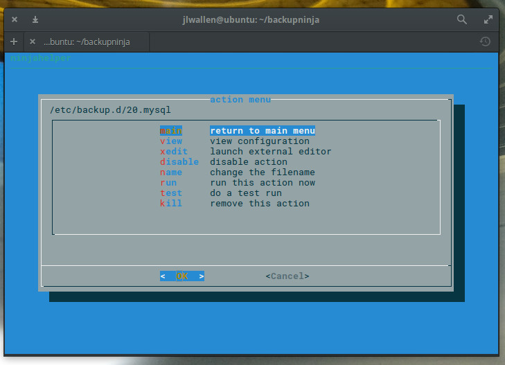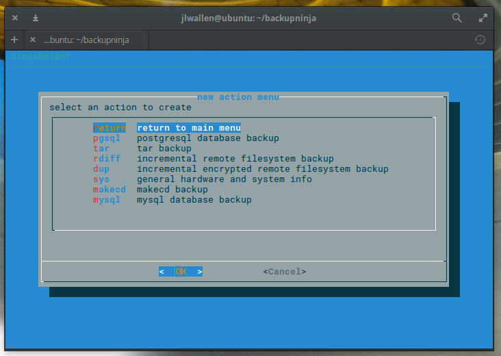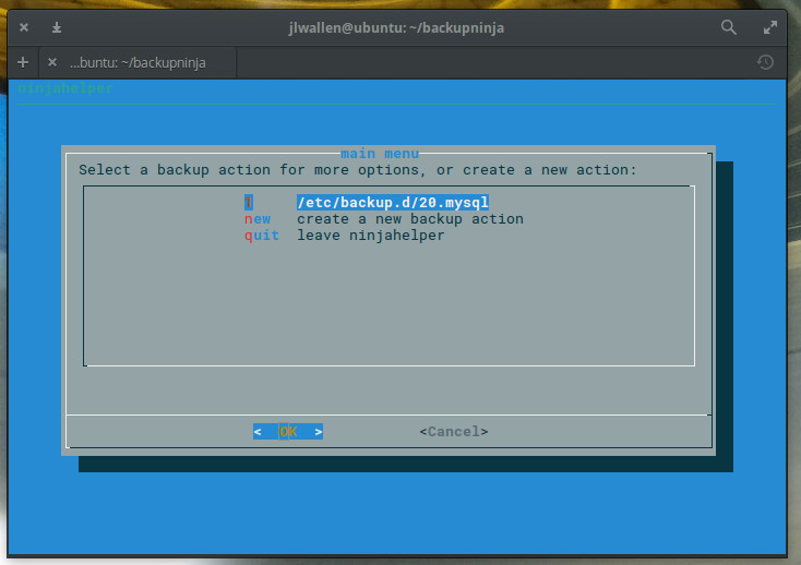 To start the Backupninja wizard, issue the command sudo ninjahelper. The wizard is an ncurses tool that will ask you a few simple questions. The first question (Figure 2), is straightforward; select new and tab down to OK. Hit Enter on your keyboard and you’re ready to configure your backup.