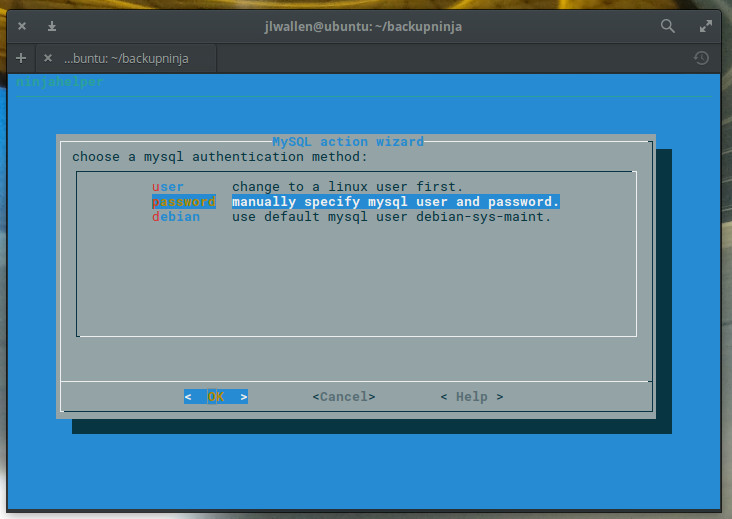 Remember, earlier, when I mentioned all you had to do was drop a configuration file into the /etc/backup.d directory? That seems to imply you would have to manually create that configuration file. You don’t. Backupninja includes a very handy setup wizard that will walk you through the configuration of your automated backup.