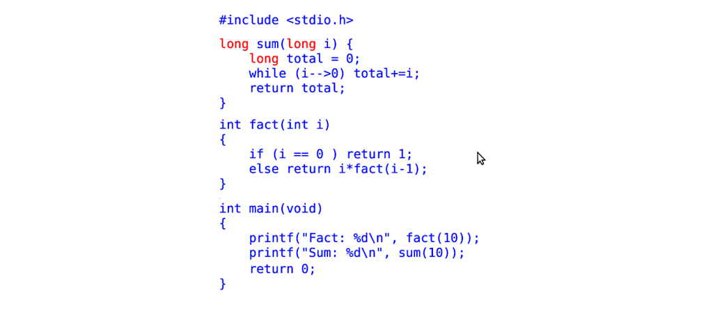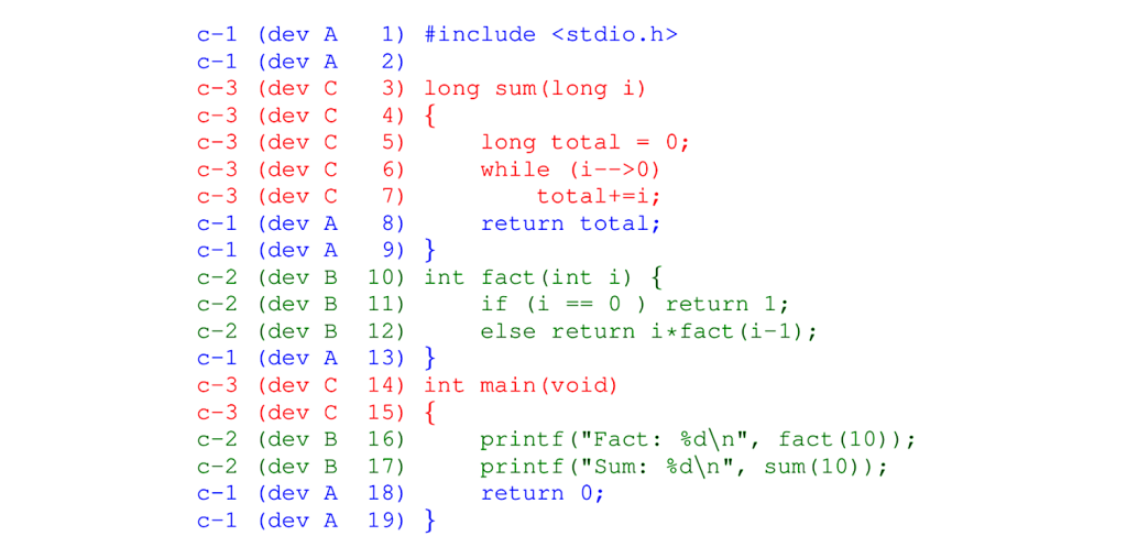 If we consider the token as the indivisible unit of source code (i.e., a token cannot be modified, it can only be removed or inserted), then what we really want is to know who is responsible for introducing each token to the source code base. A blame-per-token for the file in our example would look like the figure below. Note how it correctly shows that the only changes made by C to the source code were the replacement of int with long in three places, and that B made no changes to the code: