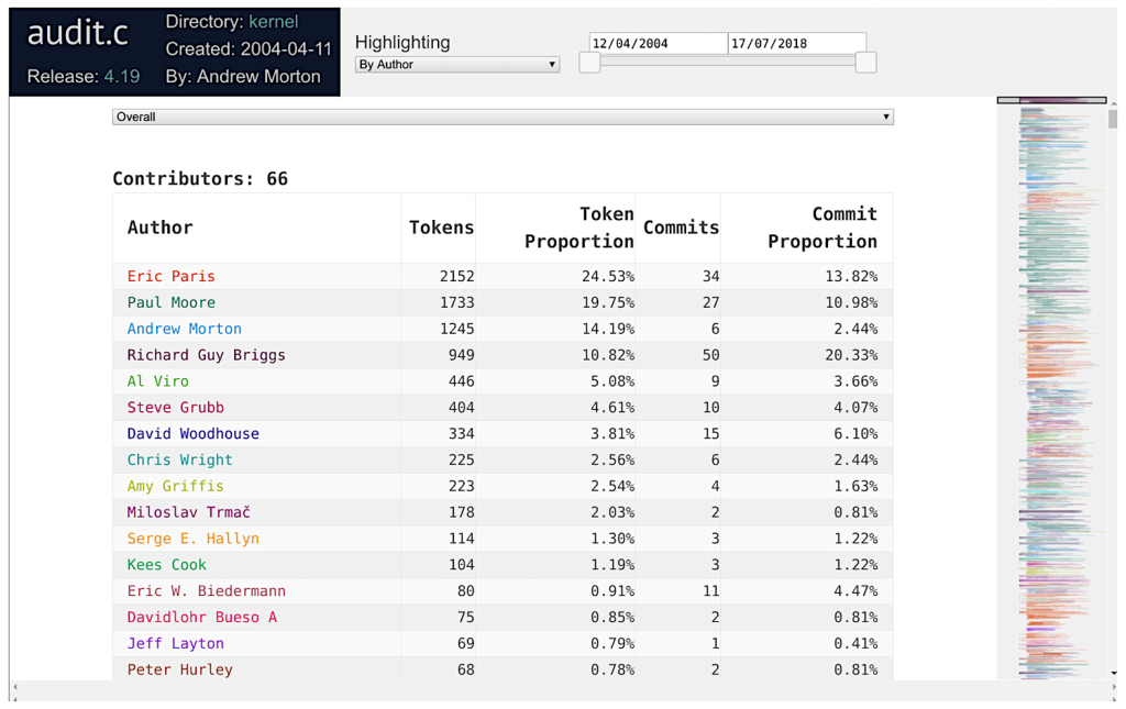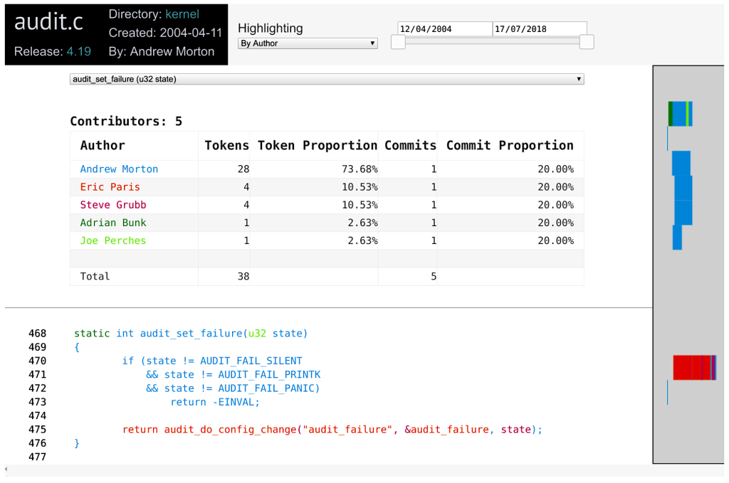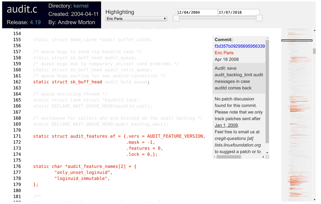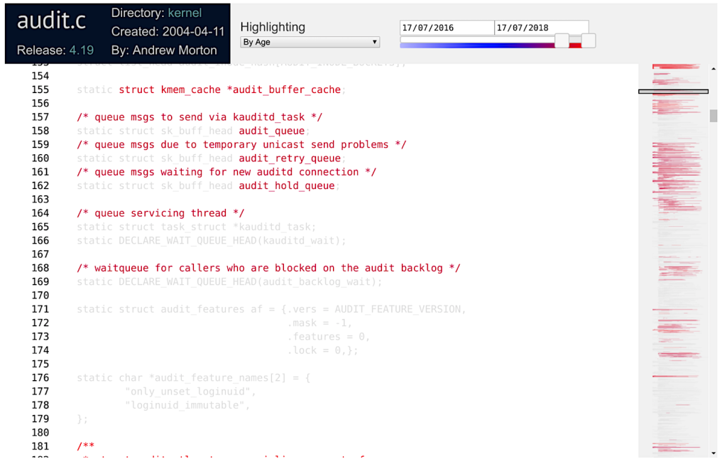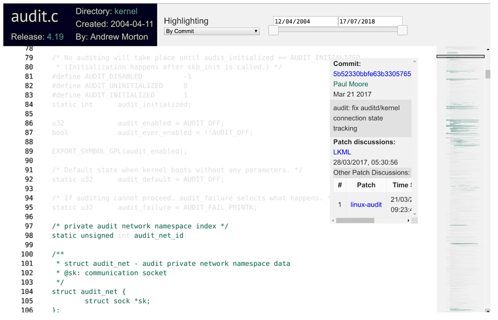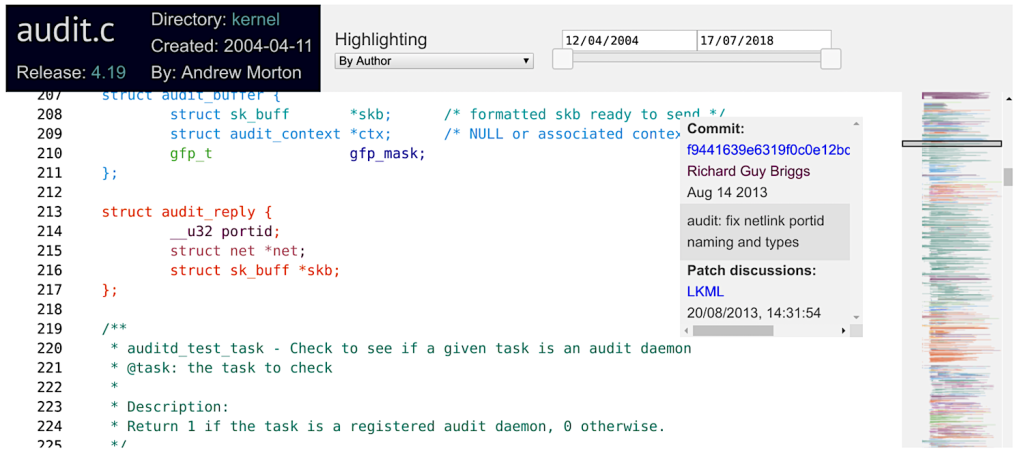 Below is an example of the blame-per-token views of Linux 4.19, specifically for the file audit.c.html.
