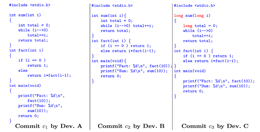Unfortunately, version control systems are only capable of tracking full lines of code. Imagine the following scenario: A simple file is created by developer A; later, it is changed by Developer B, and finally, by Developer C. The following figure depicts the contents of the files after each modification. The source code has been colored according to the developer who introduced it (blue for Developer A, green for Developer B, and red for Developer C; note that Developer B only changed whitespace –including merging some lines).