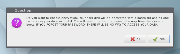 Next, you’ll be prompted to select a hard disk partitioning option. Select Automatic for the easiest installation. After making the selection, click OK. When prompted, click Yes to erase your hard drive, so Elive can be installed. The next prompt (Figure 4), allows you to enable encryption for your disk.