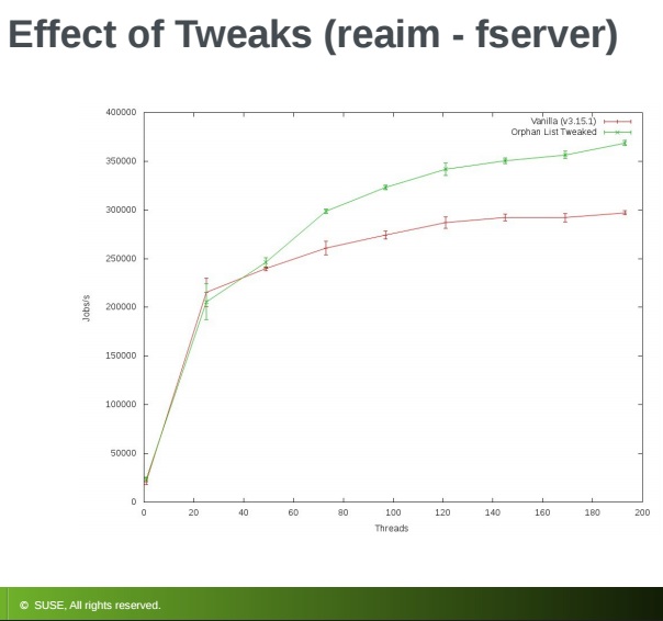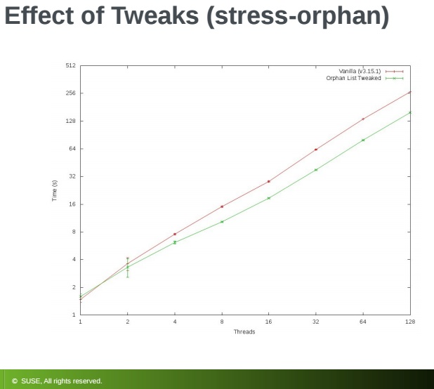 Kara made some changes to the orphan list along the lines he recommended and tested for the effect of the changes by running what he referred to as a stress-orphan micro-benchmark and a reAIM new fserver workload. There were clearly noticeable gains with the orphan stress test and even larger gains in the reAIM fserver test resulting in a measurable increase in jobs per second, he reported.