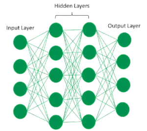 - Layers: These are the different levels of a neural network. There are three main types of layers: input layer, hidden layer, and output layer. The input layer receives the input data, the hidden layer performs the processing, and the output layer generates the output. See the following illustration:
