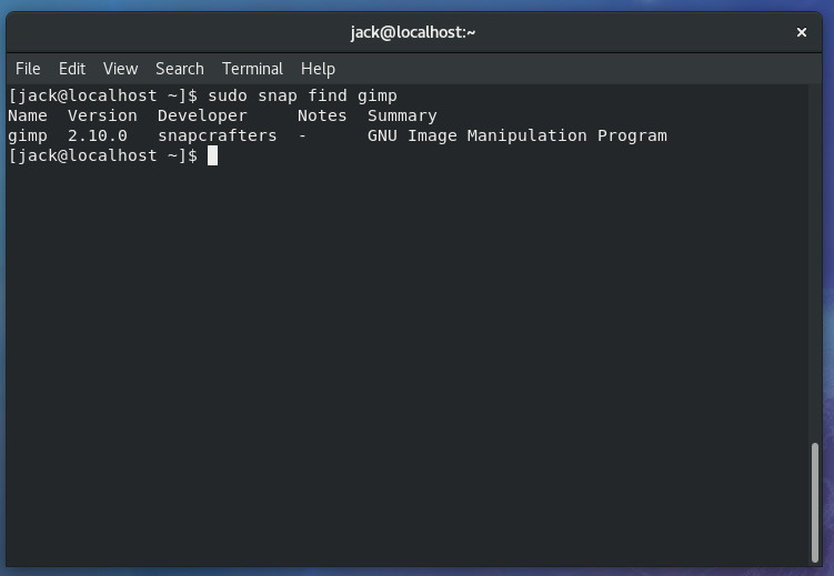 Let’s say you want to go ahead and install GIMP via Snap. To do this, issue the command: