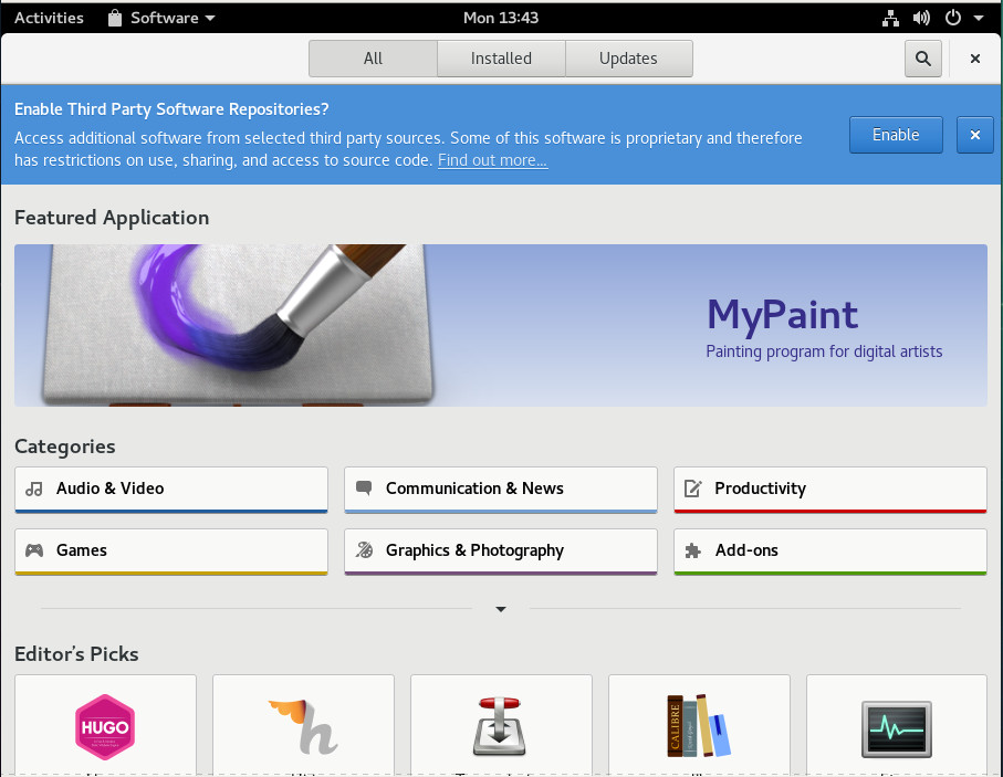 Once the command finishes, reboot your system and open up GNOME Software. You will be prompted to enable third party repositories (Figure 4). Click Enable and Snap packages are now ready to be installed.