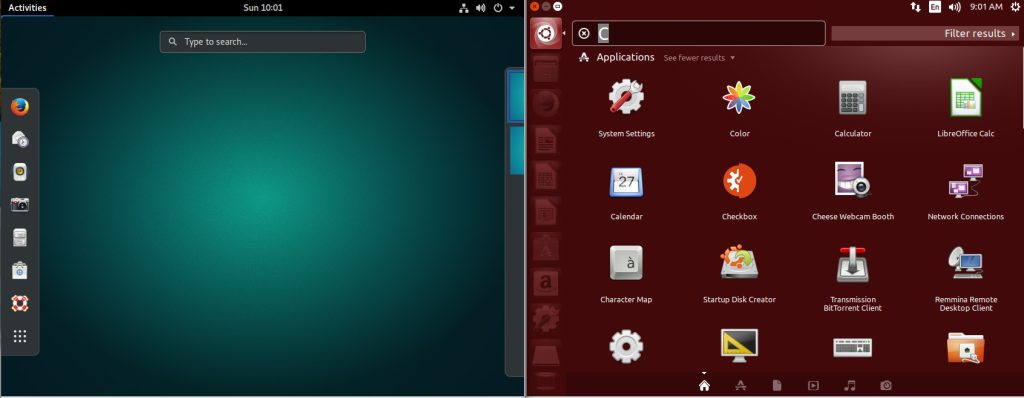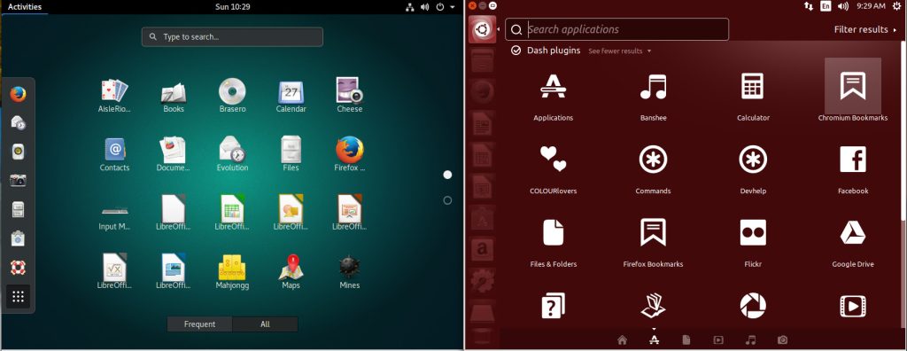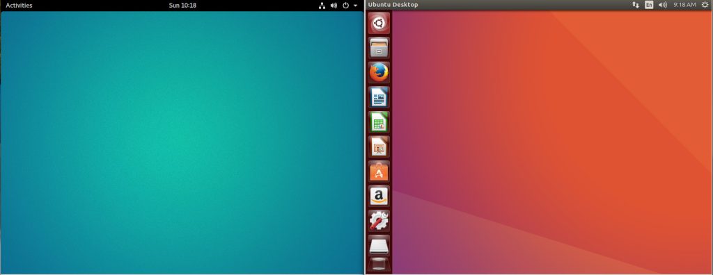 Figure 2: GNOME (left) doesn’t include a default app launcher as does Unity.