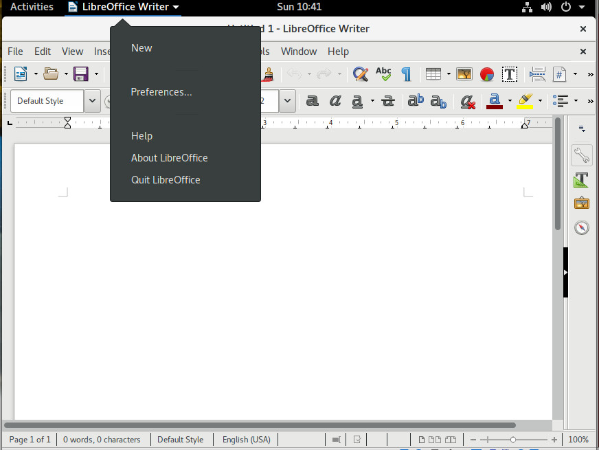 In the above image, I’ve opened the Global menu associated with LibreOffice, where you can open a new file, gain access to the LibreOffice preferences window, get help with and quit the application.