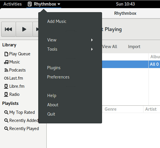 However, open Rhythmbox (the default music player in GNOME) and you’ll see there is only one menu—the Global menu—which contains all of the Rhythmbox menu options (Figure 6).
