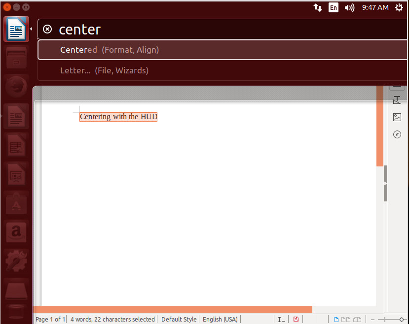 If there is one feature that power users will miss from Unity, it’s the Heads Up Display (HUD) menu. This allowed the user to hit the Alt key and bring up an overlay that would search an application’s menu. This made it incredibly easy to find the exact menu entry you wanted. Say, for example, you wanted to center text in a LibreOffice document. Type your text, highlight it, click the Alt key, type center, and then select Centered (Figure 7).