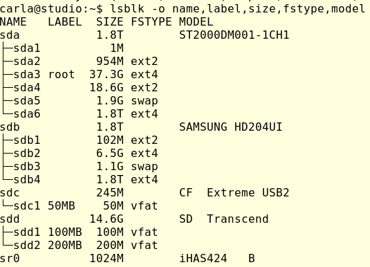 As this shows, it is possible to make mistakes. I have two 1.8TB drives. One has the root filesystem and my home directory, and the other is an extra data storage drive. lsblk accurately identifies the Compact Flash drive, an SD card, and the optical drive (sr0, iHAS424 identifies a Lite-On optical drive). If this doesn’t help you identify your drives then try findmnt: