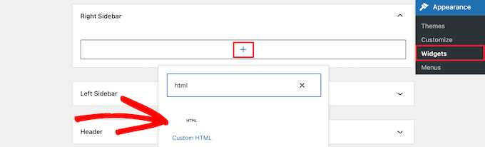 Then, click the ‘Plus’ add block icon, search for ‘HTML’, and click the block.