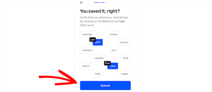 Then, you’ll need to verify your recovery phrase to prove that you copied it somewhere safe.