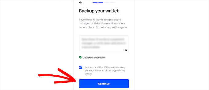 This brings up a recovery phrase. You’ll need to copy this to a safe location. Ideally, you should handwrite this down and store it in a safe place offline where it won’t get hacked, lost, or stolen.