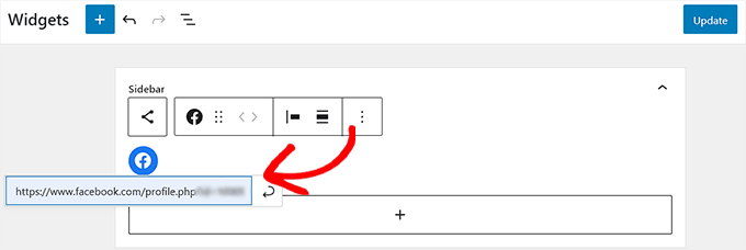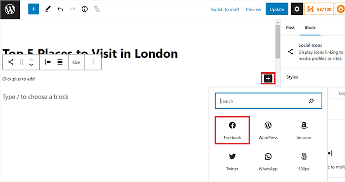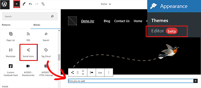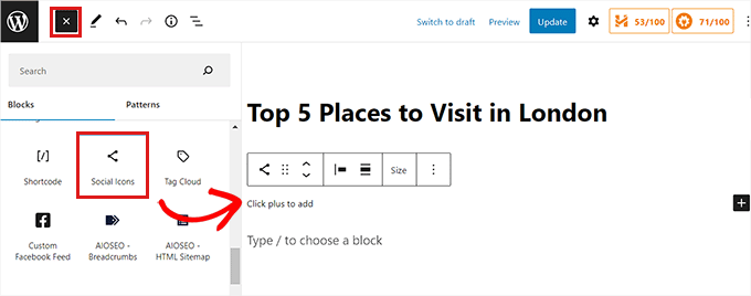 After that, you need to click the ‘(+)’ button inside the Social Icons block to open the block menu.