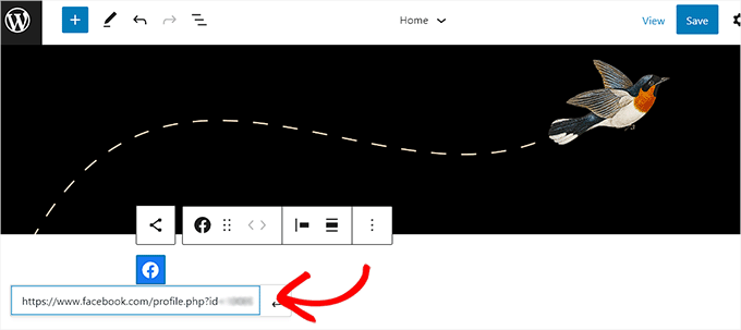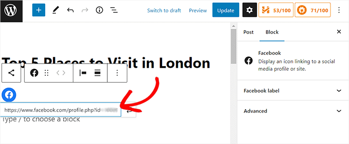 Note: Keep in mind that the Social Icons block doesn’t allow you to add text next to the Facebook icon. However, you can use the Group or Column block to add a Heading or Paragraph block beside the Facebook profile link.