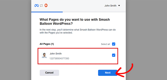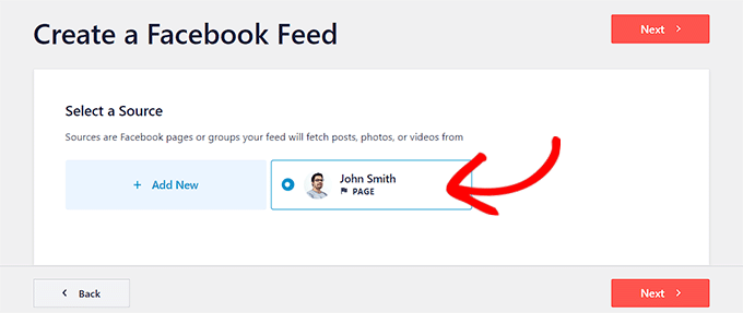 Here, the Facebook page you connected will be displayed. Simply click to select it and then click the ‘Next’ button to continue.