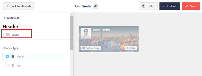 After that, you need to visit the ‘Header’ panel and toggle the switch at the top to ‘Disable’. This will disable the Feed header and create a compact layout.