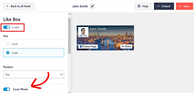 Next, you need to visit the ‘Like Box’ panel from the left column. Go ahead and switch the toggle to ‘Enable’. This will activate the Follow button.