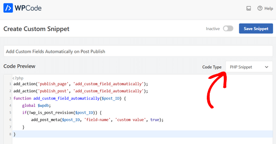 Don’t forget to choose ‘PHP Snippet’ as the code type from the dropdown menu on the right.
