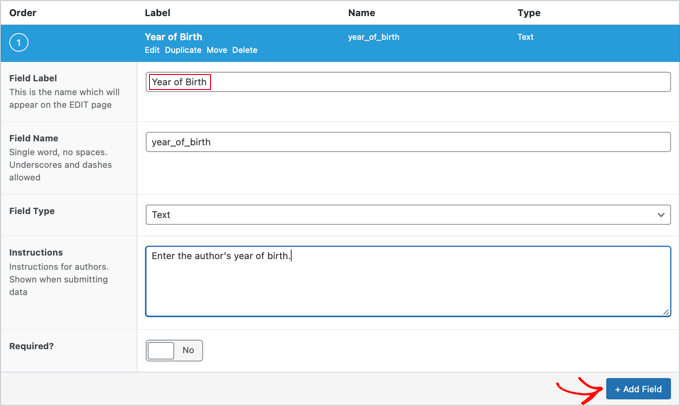 Once you’ve done that, you should click on the ‘+ Add Field’ button to add a field. A new form will appear where you can fill in the details of the new field.