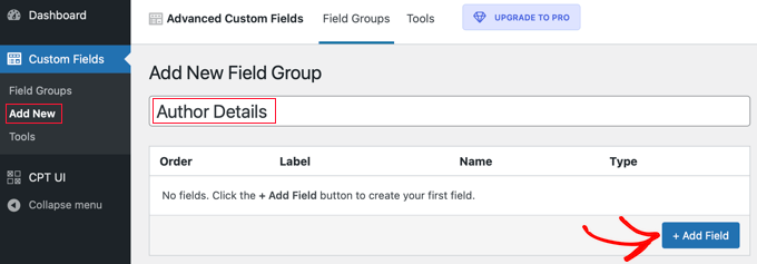 Next, head over to the Custom Fields » Add New page. Here you can add a field group that contains one or more new fields.