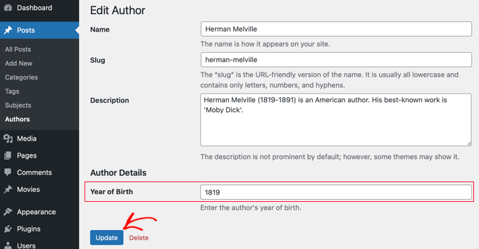 After that, we can enter data into the new field. In this case, we will enter the year of birth for that author. Don’t forget to click the ‘Update’ button to store the new data.