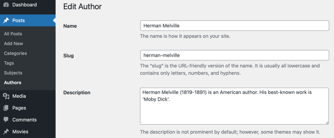 In our example, we need to enter the year of birth for each author. To do that, we need to navigate to Posts » Authors and click on the name of the author we wish to edit.