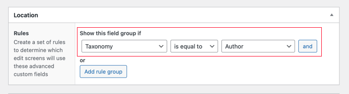 Here you can create rules that describe where to display the new field. You should select ‘Taxonomy’ from the first drop down menu and leave the middle field as ‘is equal to’. Finally, select the correct custom taxonomy for the last field. In this tutorial, we’ll select ‘Author’.