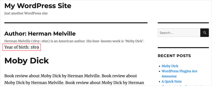 In our example, the field name is ‘year_of_birth’. We’ll also add a description so our visitors understand what the field means. So we’ll add the following code to the taxonomy archive file taxonomy-authors.php