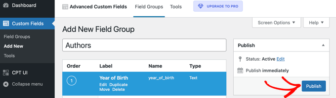You will be asked to give the field group a title, and this will be displayed along with the new fields when adding or editing the taxonomy. In this tutorial, we want to add a custom field to the Authors taxonomy, so we’ll name the field group ‘Author Details’.
