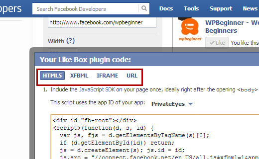 Facebook provides you multiple ways to add the like box code on your website. You can choose from HTML5, XFBML, and iframe. We will show you how to add each of them but you need to choose one. In our opinion HTML5 is a reasonably good option for most WordPress powered websites. XFBML is good for people using other Facebook plugins that use XFBML to display Facebook buttons. Use iframe if the first two options don’t work for you.